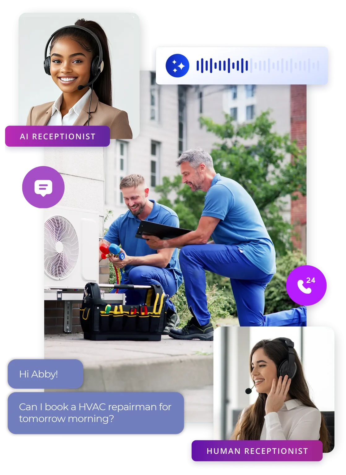 Abby helps you win more jobs, stay focused, and look professional with AI, live receptionists, or both.