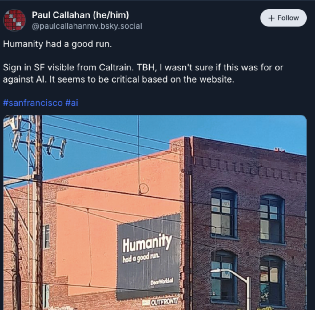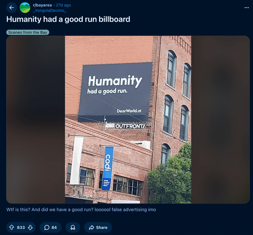 The initial response to the campaign was immediate and deeply revealing. The “Humanity Had a Good Run” billboards caught people off guard, surfacing everywhere from Reddit threads and TikTok videos to niche tech blogs. Some dismissed them as fearmongering or “sci-fi hysteria,” arguing that campaigns like this only fuel paranoia. Others saw them as a rare, unfiltered challenge to the blind optimism dominating AI discourse.